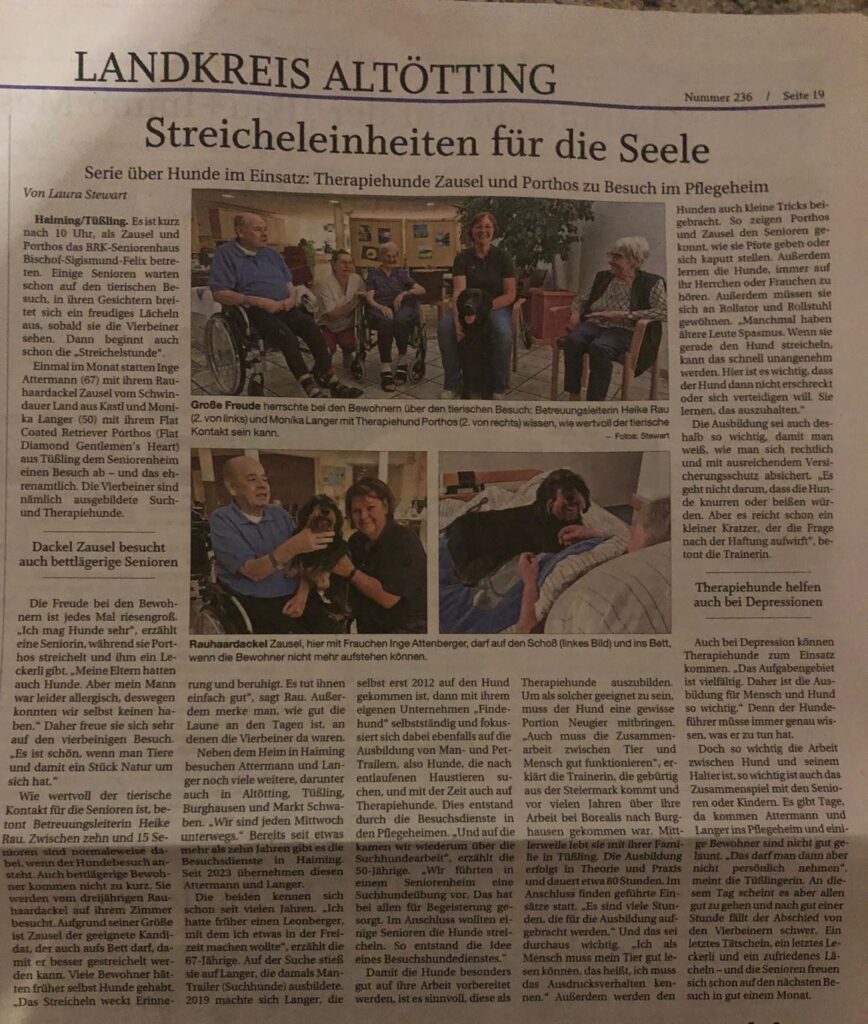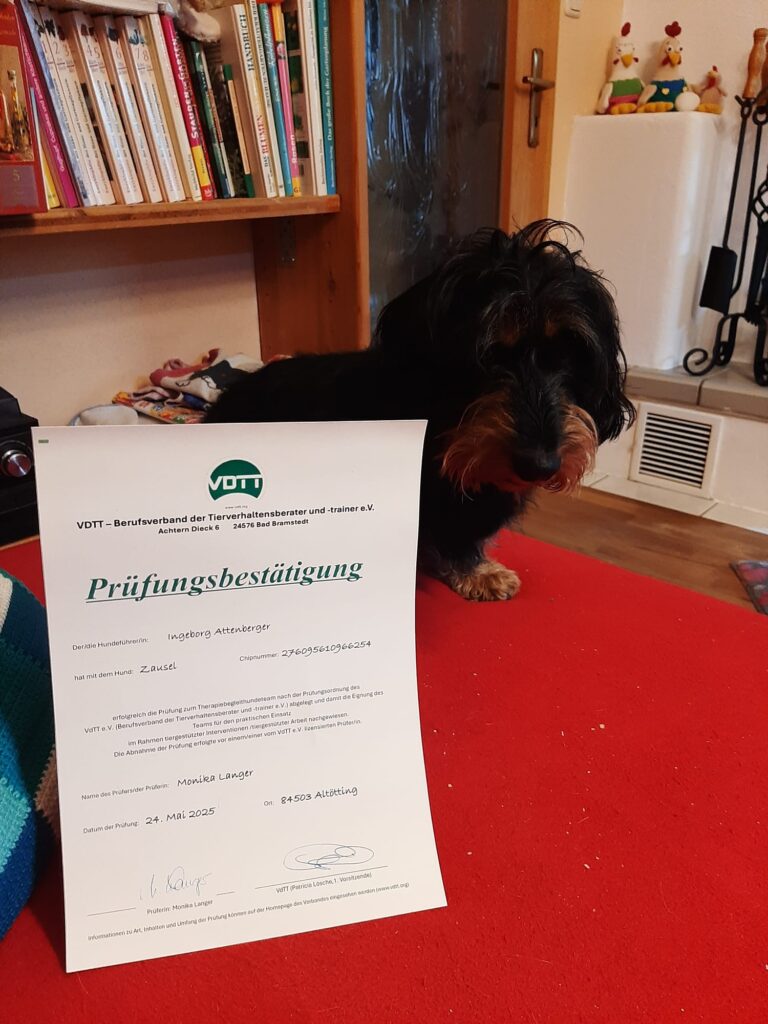 Seit 2014 bin ich (geb. 1958) im Man- und Pettrailing tätig. 2019 habe ich die Trainerprüfung abgelegt und bin seit diesem Zeitpunkt bei Findehund als Trainer angestellt. Zausel hat auf diesem Gebiet alle Prüfungen, die bei Findehund angeboten werden gemeistert. Im Frühjahr 2025 hat Zausel die Prüfung zum Therapiebegleithund mit dem Schwerpunkt Demenz bestanden und wir arbeiten in Altenheimen und Behinderteneinrichtungen in Haiming, Alt- und Neuötting, Tüssling und Markt Schwaben.