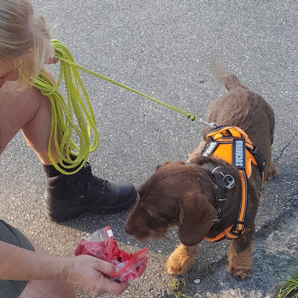 Auch beim Mantrailing arbeite ich hochkonzentriert, motiviert und zuverlässig. Andere Tiere nehme ich während der Suche wahr, bleibe aber konsequent bei meinem Auftrag. Erst wenn die Arbeit erledigt ist, ist Zeit für alles andere.