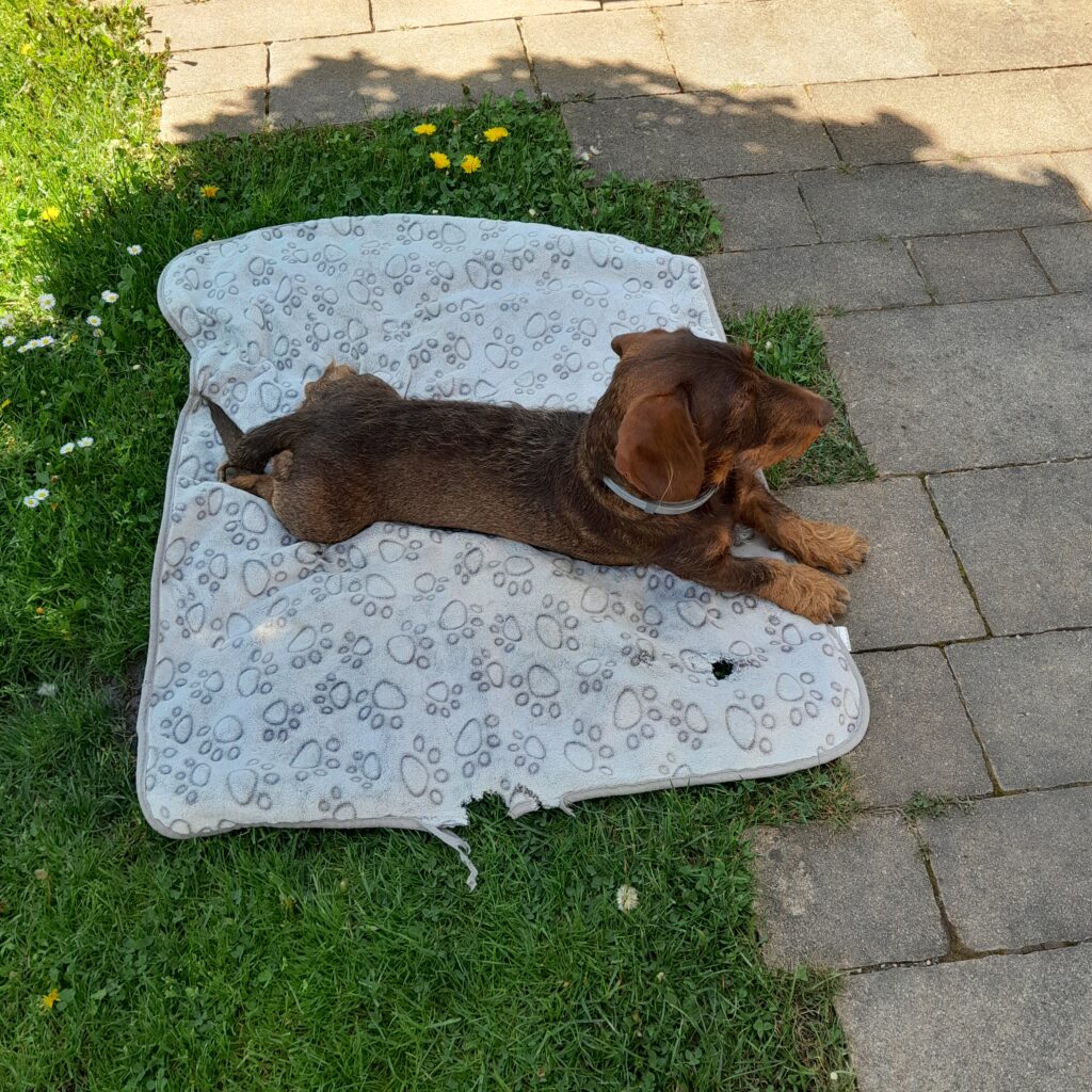 Siska ist eine Superdackeline und unser aller Herzblatt. Sie hat es wirklich schön bei uns, ist sehr anhänglich und schmusig und liebelt uns alle ab. Sehr gerne ist sie in ihrem großen Naturgarten unterwegs. Jetzt, bei der großen Hitze, badet sie täglich mehrmals in ihrem warmen Badewännchen, dann ist sie frisch für einen Spaziergang im schattigen Wald. Wir haben immer eine große Freude an ihr.