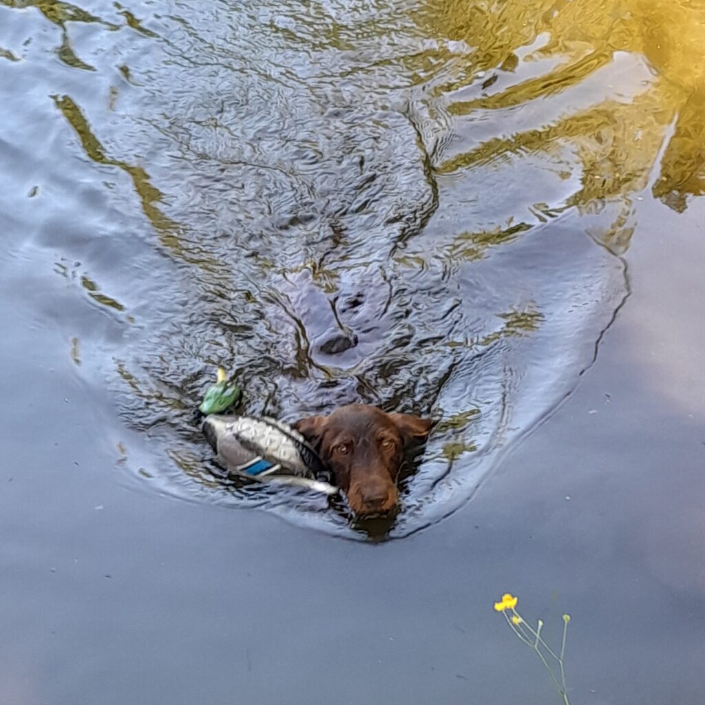 Neben dem Familienleben zeige ich auch meine jagdlichen Anlagen. Den Wassertest habe ich ruhig, sicher und zuverlässig absolviert: freudiger Sprung ins Wasser, zügiges Schwimmen zur Ente, korrekte Aufnahme und sauberes Ablegen am Ufer.